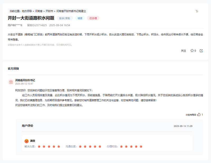 城市路途积水不只影响市民日常出行,也隐藏安全危险危险,一直是大众关怀的热点问题。近来,河南省多地网民经过人民网“领导留言板”反映路途积水困扰,有关部门分外的注重,迅速开展排查、修正及改造作业,用实际行动为市民出行保驾护航。